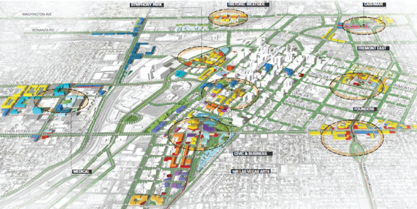 The plans focus area includes the downtown core and the surrounding districts which extend an additional 13 miles and include Cashman, Fremont East, Founders (the Huntridge area), The Arts District, Civic and Business, Symphony Park, the Historic Westside and the medical district.