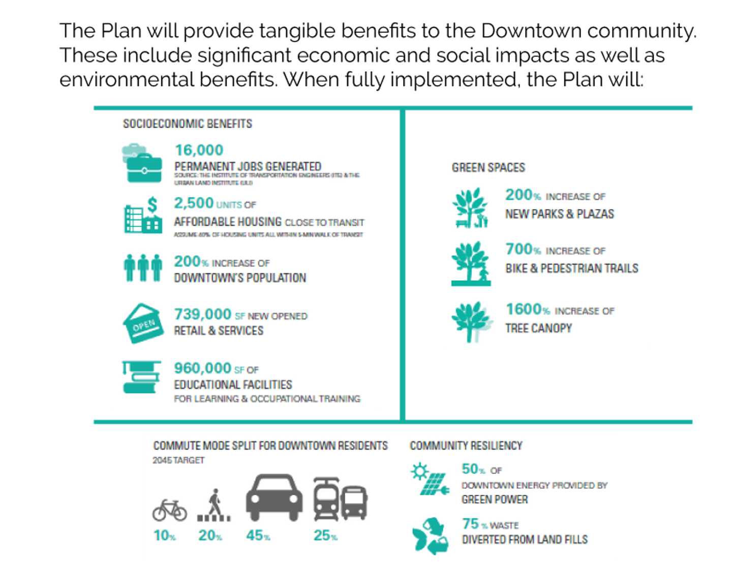 The estimated socioeconomic benefits would result in 16,000 permanent jobs, 2,500 affordable housing units, a 200 percent population increase, 739,000 square feet of new retail and service space, and 960,000 new square feet of educational facilities over its course of development.