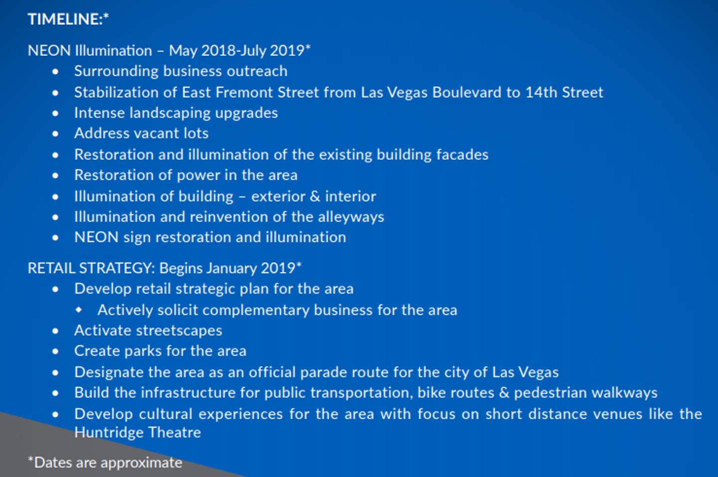 The idea is to begin by bringing green, open space, illumination and overall stabilization to East Fremont Street from Las Vegas Boulevard to 14th Street. The city of Las Vegas is working in collaboration with the local business and landowners to bring a spark of energy and eventually additional commerce to the area.